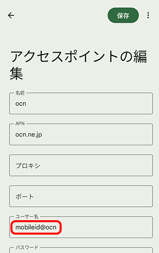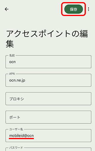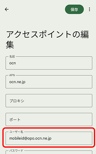 [ユーザー名]を mobileid@opo.ocn.ne.jp から、mobileid@ocn に書きかえます。