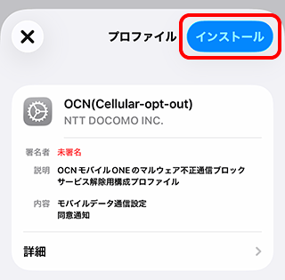 OCN モバイル ONE マルウェア不正通信ブロックサービス解除用構成プロファイルの[ダウンロード]をタップします。