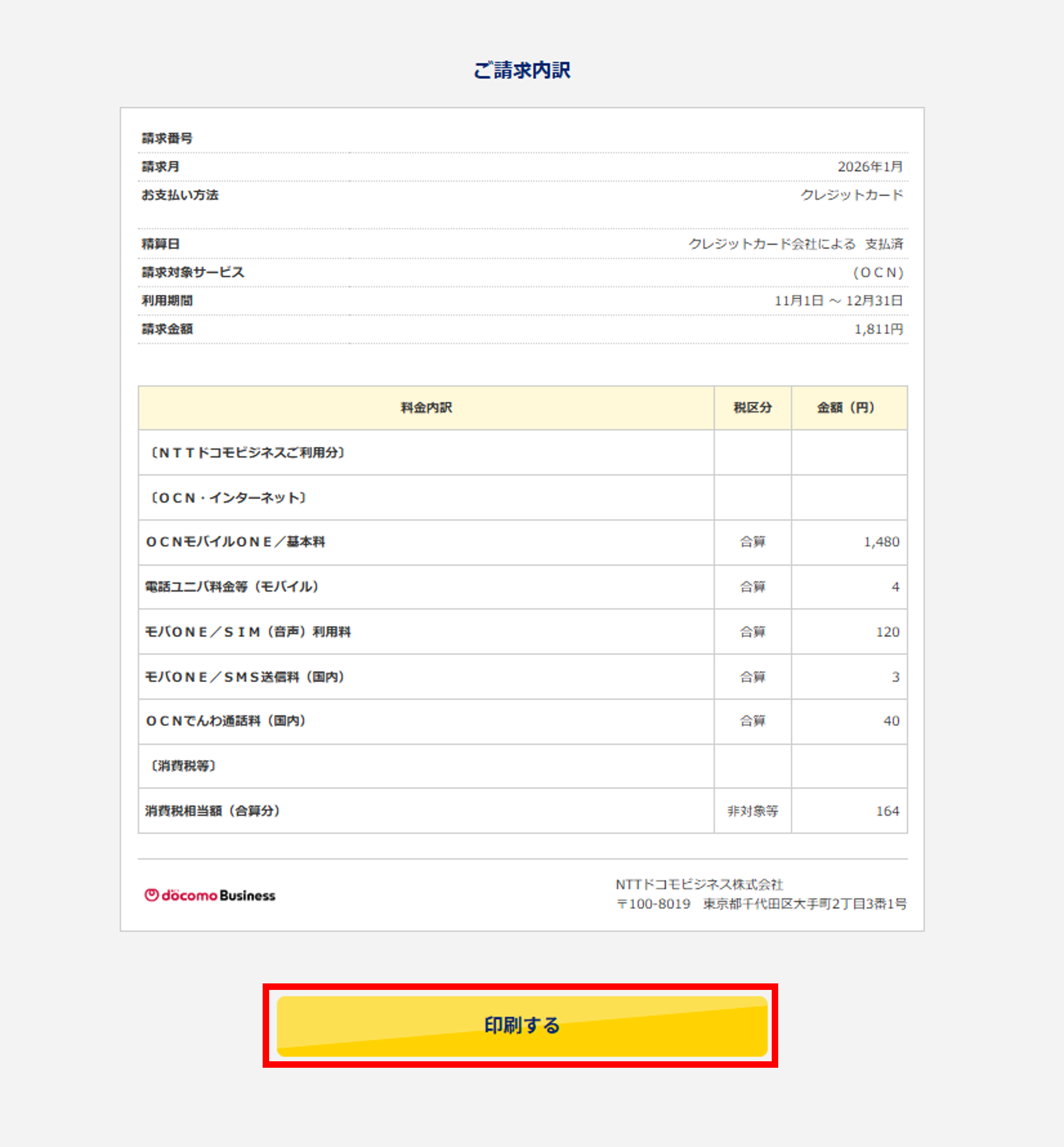 請求内訳印刷画面下部の「印刷する」ボタンを押下