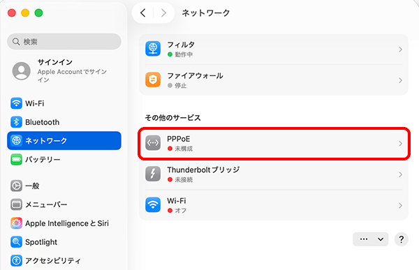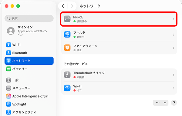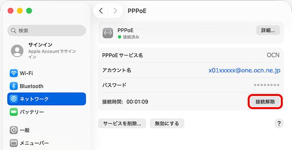 OCNのADSL回線でインターネット接続のみ利用する(IP電話サービスを利用しない)場合の、macOS Tahoe / Sequoia / Sonoma / VenturaのPPPoE設定方法をご案内します。