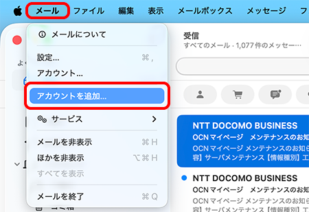 メニューバーの[メール]-[アカウントを追加]をクリックします。