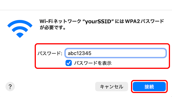 Wi-Fiメニュー]をクリックし、リストから接続するネットワークのSSIDを選択します。※ 以降の手順は[yourSSID]というSSIDに接続する場合の例です。