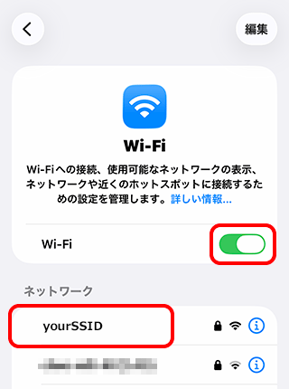 ※ 以降の手順は[yourSSID]というSSIDに接続する場合の例です。
