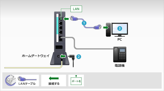 ホームゲートウェイの[LAN]ポートのいずれかと、PCの[LAN]ポートをLANケーブルで接続します。