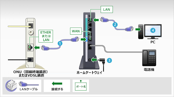 ONU(回線終端装置)の[ETHER]ポートまたはVDSL装置の[LAN]ポートと、ホームゲートウェイの[WAN]ポートをLANケーブルで接続します。