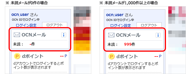 OCNトップページの未読欄に表示されるのは、「受信箱」 と 「お客さまが作成したフォルダ」にある未読メール数の合計です。※「送信済みメール」「下書き」「ゴミ箱」にあるメールは含まれません。