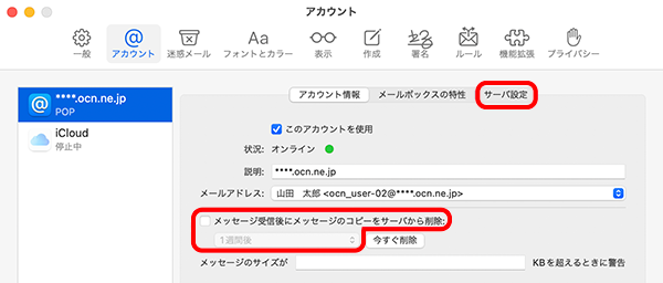 メッセージ受信後にメッセージのコピーをサーバから削除 |
