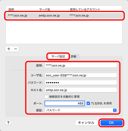 ホスト名 | smtp.ocn.ne.jp と入力 |
