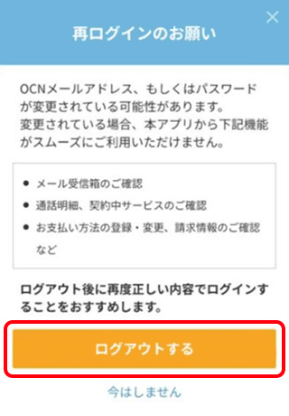 画面内の案内を確認し、変更後のメールアドレス・パスワードでログインし直す場合は[ログアウトする]をタップしてください。