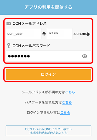 ※ ドリームネットメールのアドレスでは、OCN アプリにログインできません。