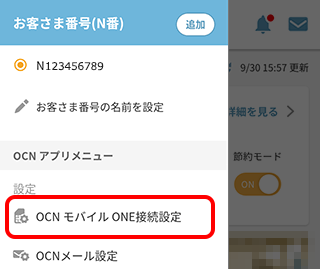 ※メニューに[OCN モバイル ONE接続設定]が表示されていない場合は、一度アプリからログアウトし、OCN モバイル ONEのメールアドレスとメールパスワードでアプリにログインしなおしてください。