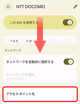 ※[詳細設定]をタップすると[アクセス ポイント名]が表示される機種もあります。