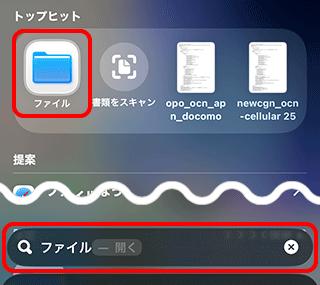 検索欄に[ファイル]と入力し、検索結果の[ファイル]をタップします。