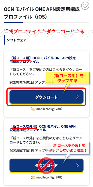 「新コース以外」用のプロファイルをダウンロードしています。OCN アプリの画面に戻り、STEP6からやり直してください。