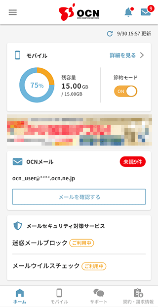 OCN モバイル ONEの契約がない「OCNメールアドレス」でアプリにログインしています。OCN モバイル ONE契約のメールアドレスでログインし直すか、お客さま番号(N番)を切り替えてご利用ください。