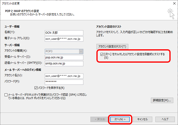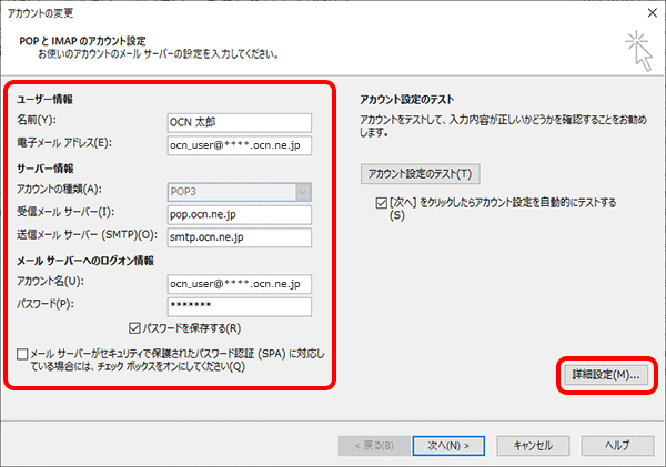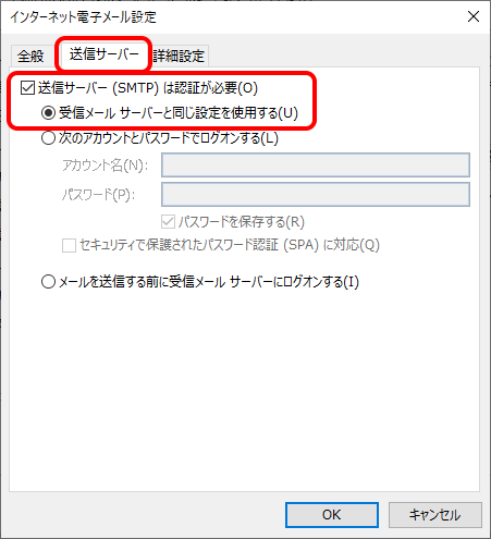 メール サーバーがセキュリティで保護されたパスワード認証(SPA)に対応している場合には、チェック ボックスをオンにしてください |