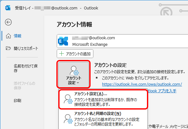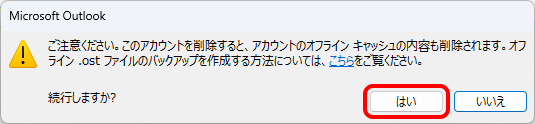 ※メールアカウントを削除しても、Outlookに保存されているメールが削除されることはありません。