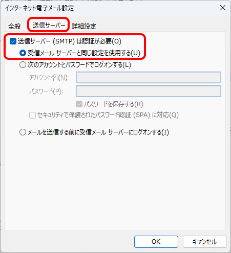 メール サーバーがセキュリティで保護されたパスワード認証(SPA)に対応している場合には、チェック ボックスをオンにしてください |