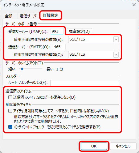 ご利用に合わせて設定する ※ チェックした場合、Outlookの[削除済みアイテム]フォルダから削除したメールは、メールサーバー上(Webメール)からも削除されますのでご注意ください。 |