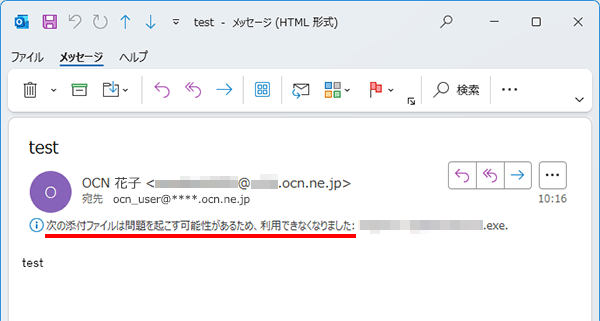 受信したメールに実行形式のファイル(.exeファイル)が添付されている可能性があります。