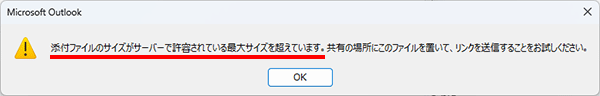 Microsoft 365で、エラーメッセージ[添付ファイルのサイズがサーバーで許容されている最大サイズを超えています。 ~]が表示された場合の対処方法をご案内します。