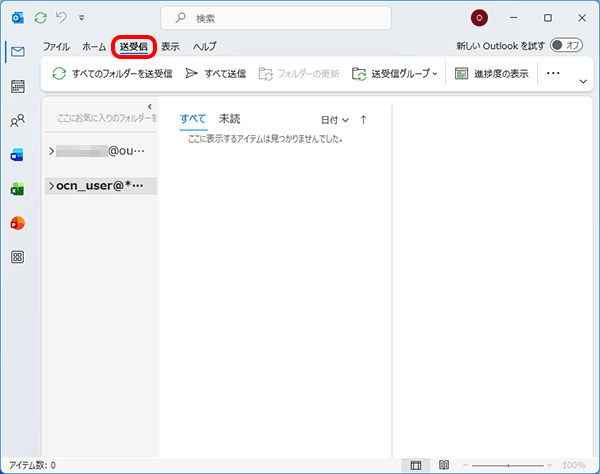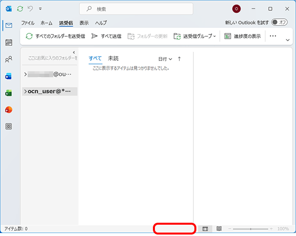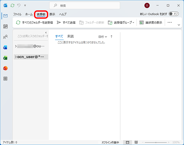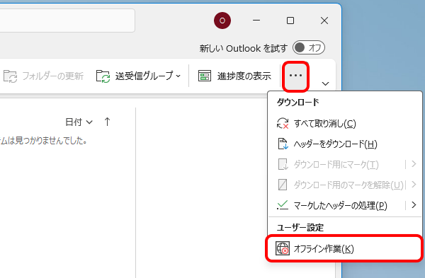 Microsoft 365がオフライン作業になっていると、インターネットに接続されていてもメールの送受信はできません。以下の手順でオフライン作業を解除してください。