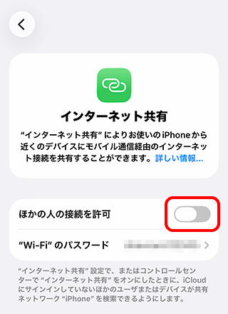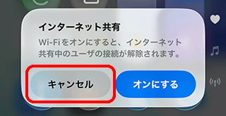 一部の機種を除き、コントロールセンター画面などからWi-Fi接続をしようとすると、以下の画面が表示されます。Wi-Fiをオンにするとテザリングができなくなりますのでご注意ください。