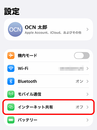 「設定」⇒「モバイル通信」⇒「モバイル通信プラン」⇒「モバイルデータ通信ネットワーク」を選択し、「インターネット共有」に以下のAPN設定を入力