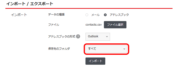 [保存先のフォルダ]を[連絡先]などへ変更し、再度インポートをお試しください。