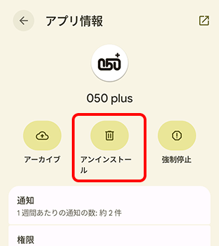 「050 plus」アプリをAndroid端末からアンインストールする方法をご案内します。