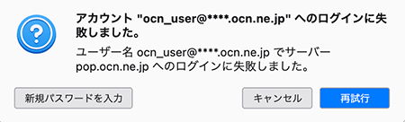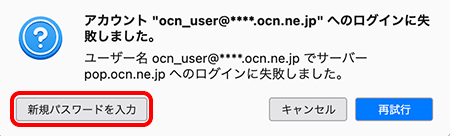 [新規パスワードを入力]をクリックして上記画面を表示し、メールパスワードに誤りがないことを確認して、正しく入力します。