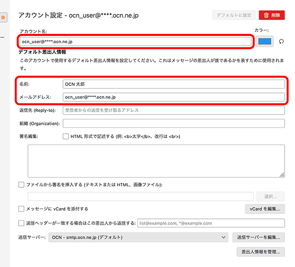 | アカウント名 | 受信トレイや一覧で表示する、このアカウントの名称を入力 例)「OCN」「仕事用」など |