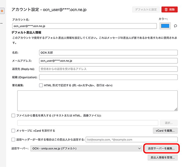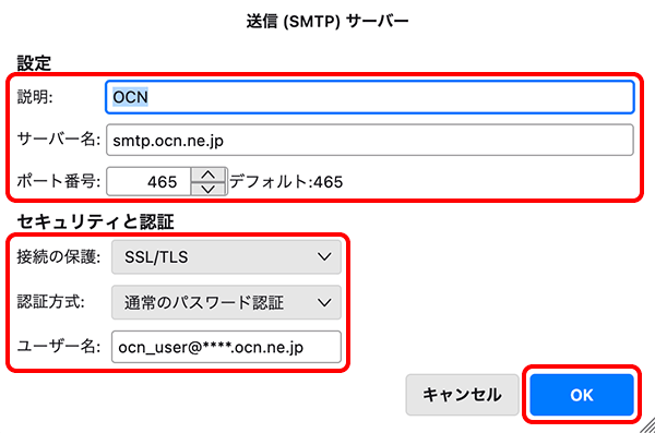 | サーバー名 | smtp.ocn.ne.jp と入力 |