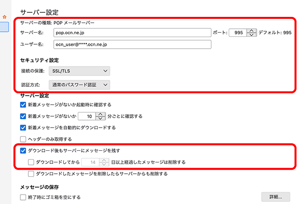 | ダウンロードしてから~日以上経過したメッセージは削除する | Webメールや他の端末でも同じメールを受信する場合はチェックしない |