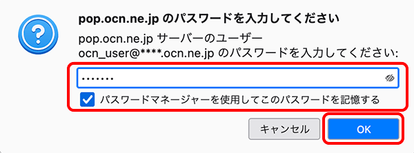 | パスワードマネージャーを使用してこのパスワードを記憶する | 送受信時にパスワード入力を省略したい場合はチェックする |
