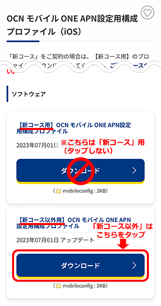 「新コース」用のプロファイルをダウンロードしています。OCN アプリの画面に戻り、STEP7からやり直してください。