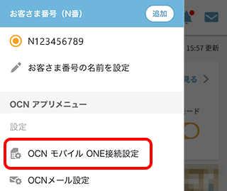 ※メニューに[OCN モバイル ONE接続設定]が表示されていない場合は、一度アプリからログアウトし、OCN モバイル ONEのメールアドレスとメールパスワードでアプリにログインしなおしてください。