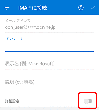 IMAP ホスト名 | imap.ocn.ne.jp と入力 |
