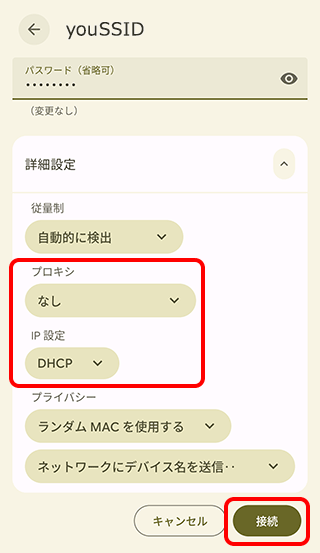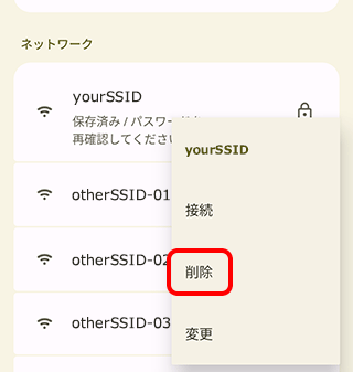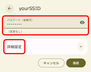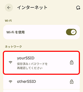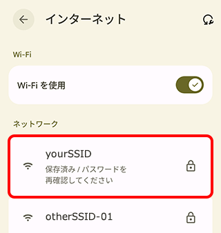 ※ 以降の手順は[yourSSID]というSSIDに接続する場合の例です。