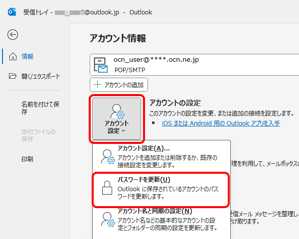 Outlook 2024で、POPで設定したOCNのメールパスワードを変更する方法をご案内します。