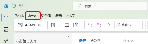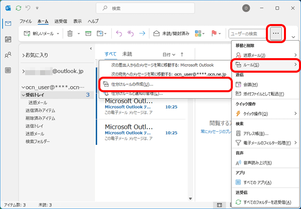 ※[仕分けルールの作成]がグレーアウトしている場合は、画面左側で[受信トレイ]を選択後、本手順を行ってください。
