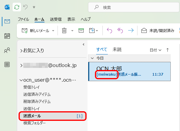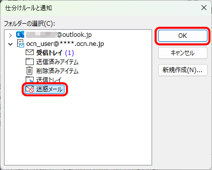Outlook 2024で、OCNの[迷惑メール自動判定]にて迷惑メールと判定されたメールを、フォルダーに振り分ける方法をご案内します。