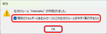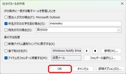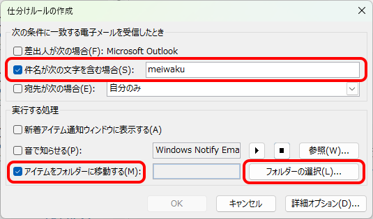 件名が次の文字を含む場合 | 入力欄に meiwaku と入力し、チェックする |