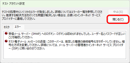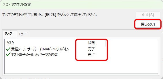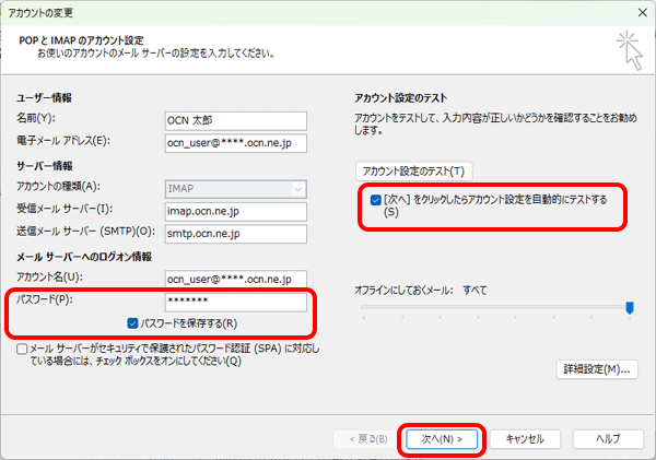 [次へ]をクリックしたらアカウント設定を自動的にテストする |