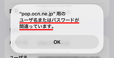 iOS 26の標準メールアプリでエラーメッセージ[”pop.ocn.ne.jp” 用のユーザ名またはパスワードが間違っています。]が表示された場合の対処方法をご案内します。