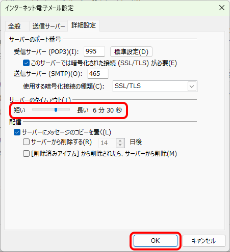 この設定で送受信ができない場合は、さらに時間を長く設定してお試しください。