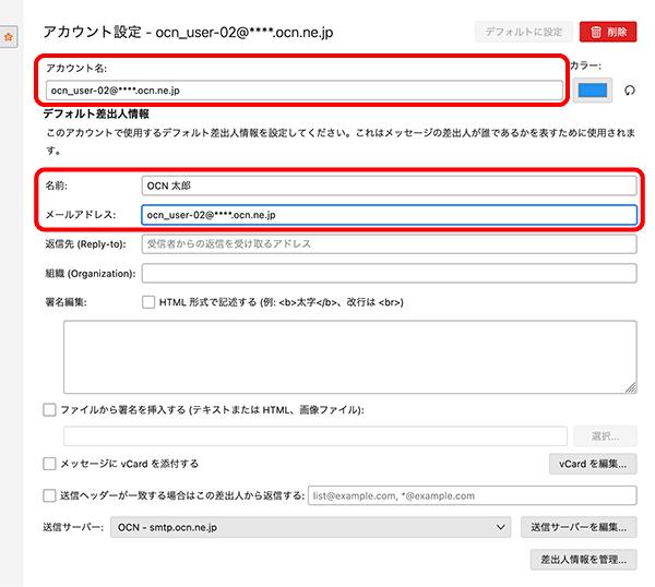 | アカウント名 | 受信トレイや一覧で表示する、このアカウントの名称を入力 例)「OCN」「仕事用」など  |