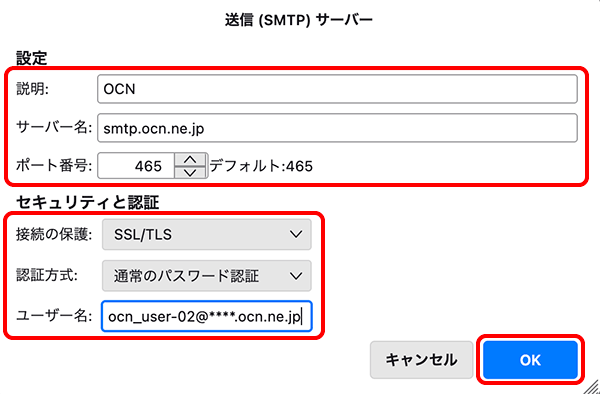 | サーバー名 | smtp.ocn.ne.jp と入力 |