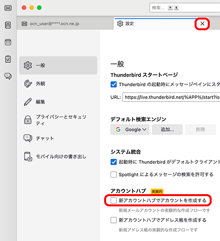 [アカウントハブ]欄の[新アカウントハブでアカウントを作成する]のチェックを外し、[×タブを閉じる]をクリックします。