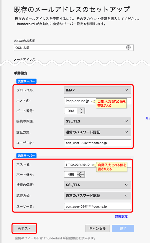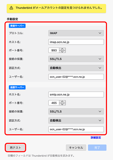 [手動設定]欄の設定内容に誤りがないことを確認して正しく入力し、[再テスト]をクリックします。